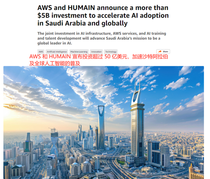 近日,亚马逊旗下云业务Amazon Web Services(AWS)就宣布和沙特HUMAIN公司达成合作,双方将投资超50亿美元在沙特建设“AI特区”,旨在通过构建智能化基础设施、培育本土技术人才、开发阿拉伯语大语言模型等举措,推动沙特实现“2030愿景”经济转型目标。