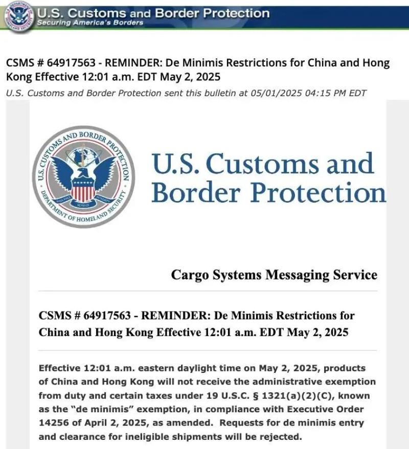 美国取消小额包裹免税政策 图源:美国海关和边境保护局