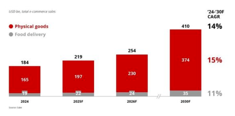2030年东南亚电商销售额将翻倍增长 图源:DBS
