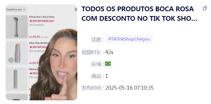 近期,一家名为Boca Rosa BR的美妆品牌迅速崛起并大放异彩,在TikTok巴西市场的表现堪称惊艳,多款产品刚上架便强势冲进本土热销榜前10。据权威数据平台Echotik数据,在TikTok巴西上架仅仅半个多月,Boca Rosa已经成功售出了4万多件商品,累计销售额为308万。目前,该品牌在TikTok平台上已经积累了超过15万的粉丝量,收获了高达150万的点赞量,影响力还在不断扩大。