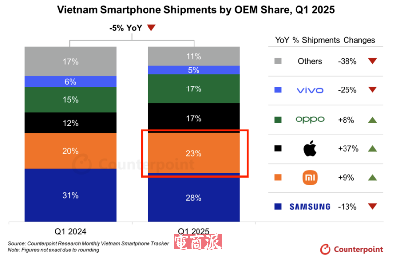 不久前Counterpoint发布最新数据显示,在2025年第一季度,越南智能手机市场整体出货量同比下降5%,但小米逆风增长,出货量同比上涨9%,市场份额达23%,成为Top5中唯一正增长的品牌。