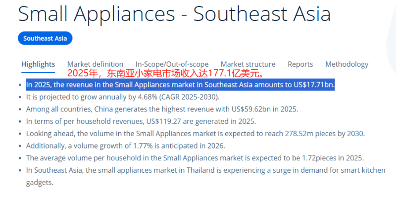 从东南亚市场小家电领域自身的发展情况来看,同样是迎来了爆发式增长。Statista数据显示,到2025年,东南亚小家电市场规模将突破177.1亿美元,并且还远远没有到顶,未来将继续保持增长趋势。