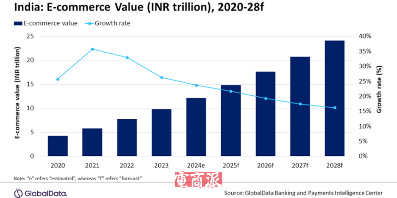 数据和分析公司GlobalData此前就发布研究指出,印度电商市场发展相当迅猛,2024年印度电商市场的规模将同比增长23.8%,达到惊人的12.2万亿印度卢比。并且这一数字还将继续上涨,到2028年该电商市场规模有望增长到24.1万亿印度卢比,刷新历史纪录。