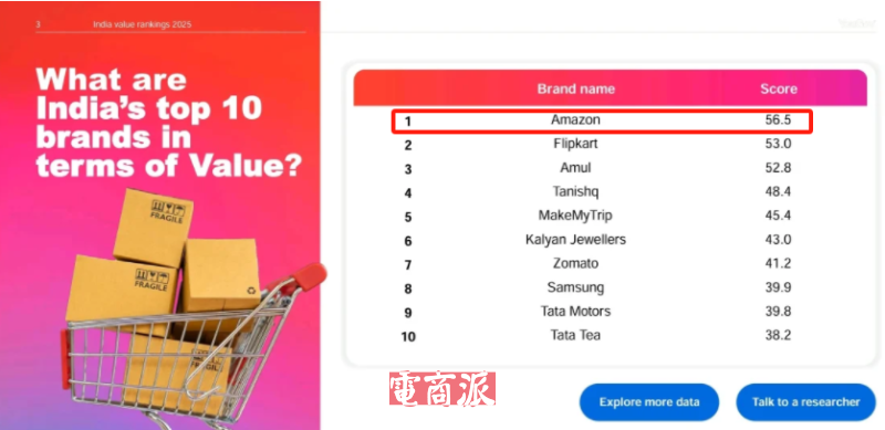 另外,在今年3月YouGov发布的最新的品牌价值指数报告中也直接指出,亚马逊以56.5分的高分力压一众对手,直接登顶印度品牌价值榜榜首。