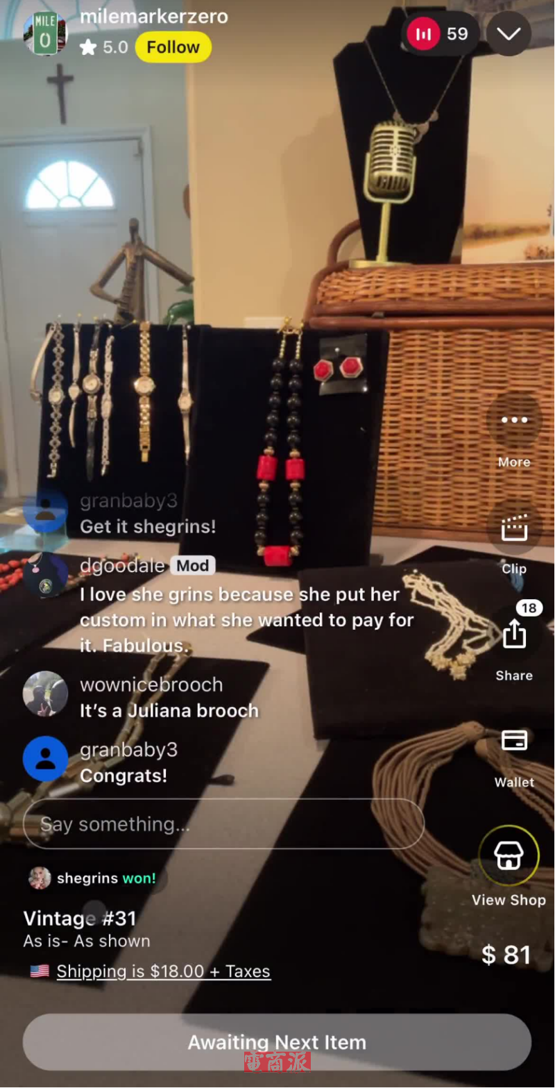 卖家直播销售首饰 图源:Whatnot
