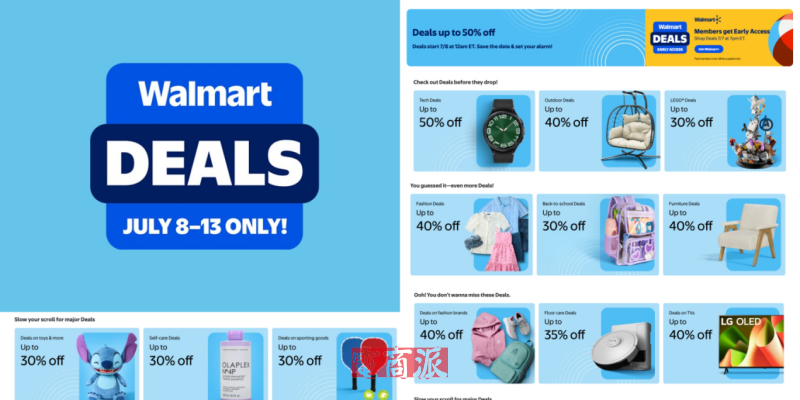另一大原因便是市场竞争,比如沃尔玛夏季特卖活动也在7月举行(7.8-7.13),而且活动时间与亚马逊Prime Day重叠,同一天开场,晚两天闭场。这期间,沃尔玛提供的优惠也足够亮眼,部分户外、科技等品类产品折扣达50%。