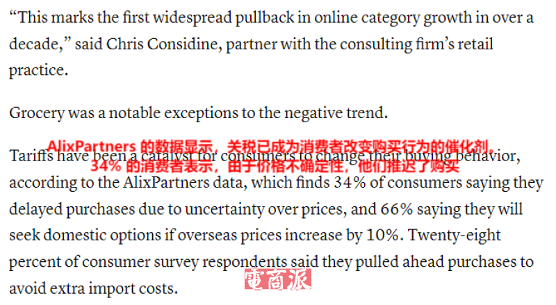 美国咨询公司Alix Partners发布的调查报告就显示,关税政策变化在一定程度上改变了消费者的网购行为,大约34%的受访者表示,由于关税导致的价格不确定性,他们普遍延迟了一些本来要做的购买决定。