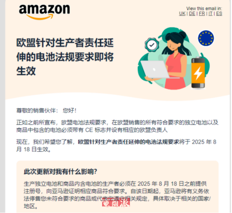值得一提的是,早在去年七月,亚马逊就已经针对欧盟电池法新规向平台卖家做出了要求,几乎和TikTok Shop保持一致的态度,即所有在欧盟销售的独立电池及内置电池的商品必须在2025年8月18日前完成注册并提交相关注册号,否则将面临商品停售的风险。