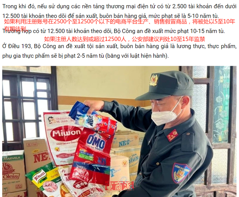 今年4月份,越南公安部在修订刑法草案中,提出要对电商平台售假行为加大惩处力度,旨在打击愈发猖獗的售假现象。具体来看,利用注册账号在2500-12500个之间的电商平台卖假货,将被处以5-10年的有期徒刑;若平台注册账号在12500个及以上,卖假货的人就要面临10-15年的监禁。此外,相关部门还针对生产、销售假冒伪劣商品等情况以及这些行为所造成的伤害、非法获利、损害程度的不同,制定了相应的罚款和刑期标准。