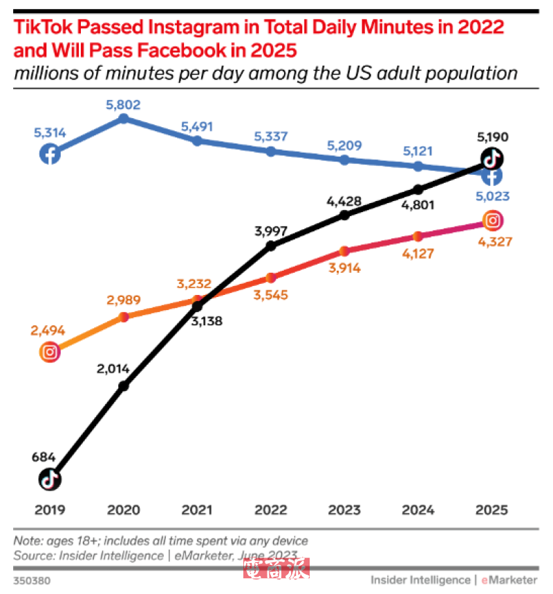 TikTok有望成为日均使用时长最多的社媒 图源:eMarketer