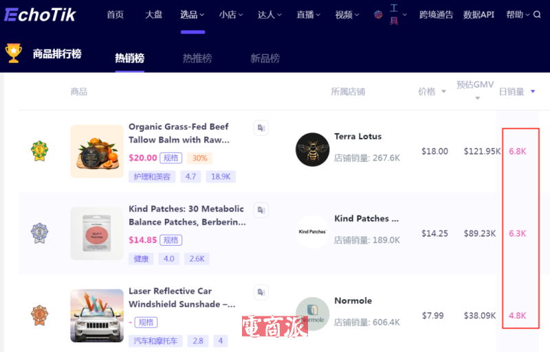 “事实胜于雄辩”,让我们来用数据说话。打开Echotik的热销榜单可以看到,各类热卖单品如雨后春笋般不断涌现。单单是在7月9日这一天,单日销量在3000件及3000件以上的就有12款产品。其中,热销榜单前三的分别是手工制作的全天然润肤霜、代谢平衡贴片和汽车挡风玻璃遮阳板,单日销量分别为6800件、6300件、4800件。