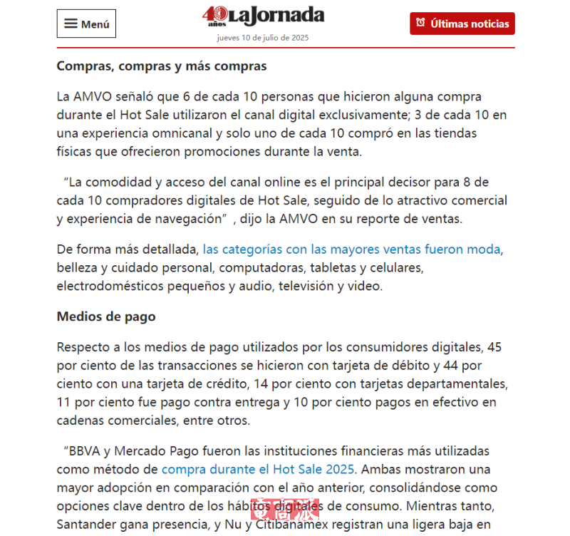 7月11日消息,墨西哥在线销售协会(AMVO)数据显示,2025年墨西哥Hot Sale电商促销活动创下历史新高,总销售额达427亿墨西哥比索(约合25亿美元),同比增长23.7%。
