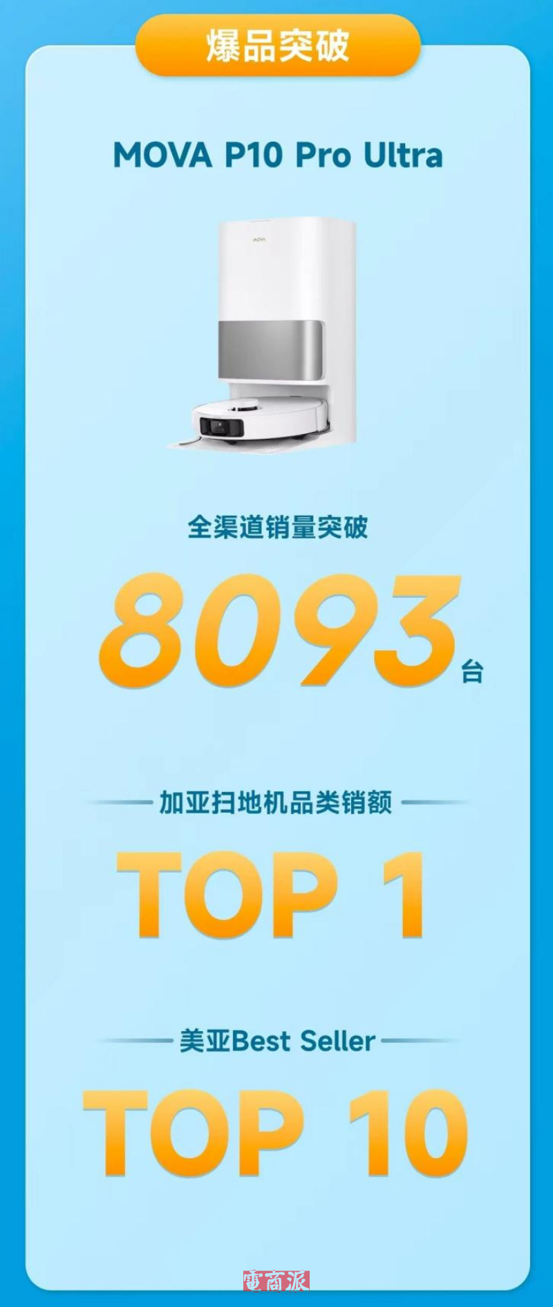 与此同时,在北美市场,MOVA同样迎来重大突破,全渠道GMV达3461万元,直接刷新品牌北美销售纪录,旗下王牌单品扫地机P10 Pro Ultra销售火爆,销量突破8000台。分地区看,在加拿大市场,MOVA扫地机稳居同品类销售额第一;在美国市场,MOVA扫地机也是同类目BSR TOP 10,品牌影响力十分强劲。