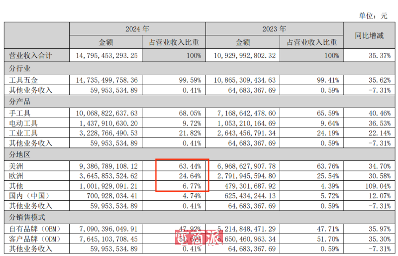 对于一家高度依赖海外市场的企业来说,这个成绩足够亮眼。财报显示,截至去年底,巨星科技超过90%的收入来自海外市场,其中美洲地区占比最高,超过60%。这意味着,4月特朗普掀起的关税风暴,也将对巨星科技造成极大冲击。