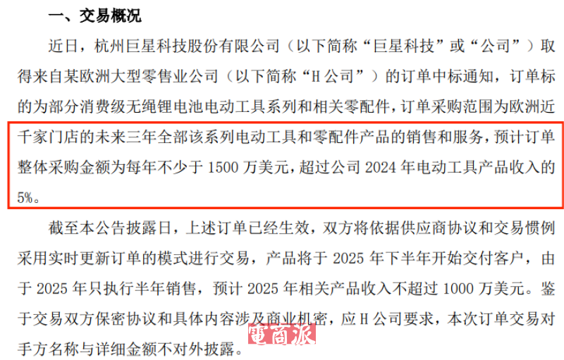 巨星科技拿下欧洲客户大单 图源:巨潮资讯