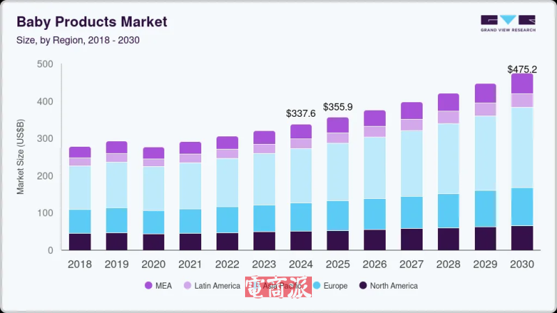 商业公司Grand View Research的数据显示,2023年全球婴儿用品市场规模大约为3206.5亿美元,预计2030年将上涨至4751.5亿美元,复合年增长率为5.9%。