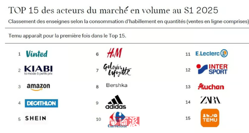 根据法国时尚研究院(IFM)发布的最新数据,尽管2025年上半年法国时尚品牌的总市场规模仅增长了0.1%,但拼多多海外分支Temu在法国时尚零售行业的影响力还是得到明显增强,并首次跻身法国服装销售前15强。