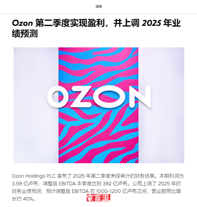 值得一提的是,近日,Ozon公布2025年第二季度财务报告。财报显示,Ozon二季度总营收达到2276亿卢布,同比增长87%;毛利润同比增长近四倍,达到575亿卢布。分业务来看,Ozon二季度电商业务营收1894亿卢布,同比增长73%,主要由于服务收入显著提升;GMV(含服务)达到9584亿卢布,同比增长51%;活跃买家数超过6000万;订单量增长61%,用户年均订单量达30单,同比增长26%。
