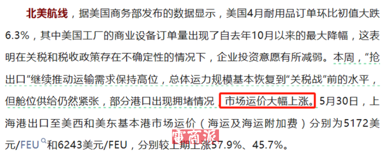 上海航运交易所的数据就显示,5月16日,上海港出口至美西基本港市场运价涨幅高达31.7%,美东基本港市场运价涨幅达到了22%;5月30日,上海港出口至美西和美东基本港市场运价(海运及海运附加费)分别为5172美元/FEU和6243美元/FEU,分别较上期上涨57.9%、45.7%。