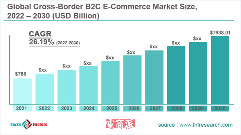 一方面,随着全球经济联动性的持续加强,全球跨境电商赛道正释放出前所未有的活力。来自Fscts and Factors的数据显示,全球B2C跨境电商市场规模预计将从2021年的7850亿美元,跃升至2030年的79380亿美元,期间数据保持稳步上涨。