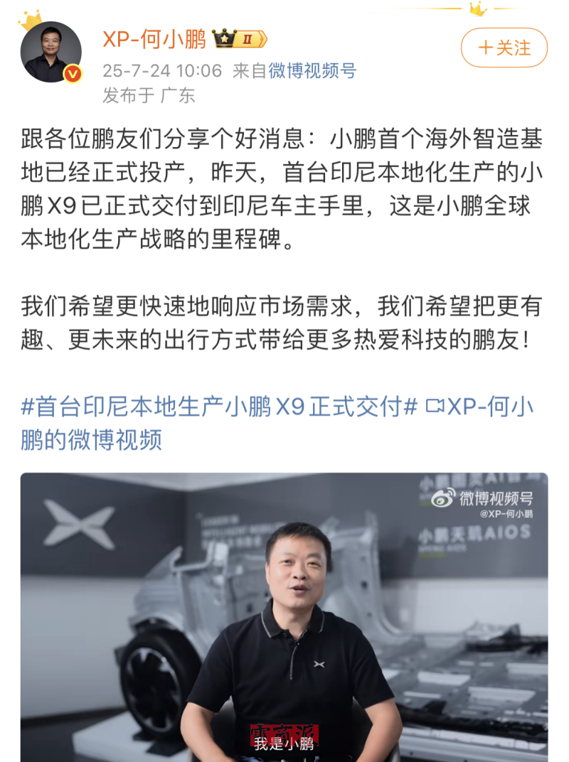 同一时间,小鹏汽车还透露最新生产建设计划,小鹏汽车董事长兼CEO何小鹏发文表示,小鹏汽车首个海外智造基地已正式投产,接下来,从技术创新到人才培养,小鹏汽车将全面深入印尼本土。