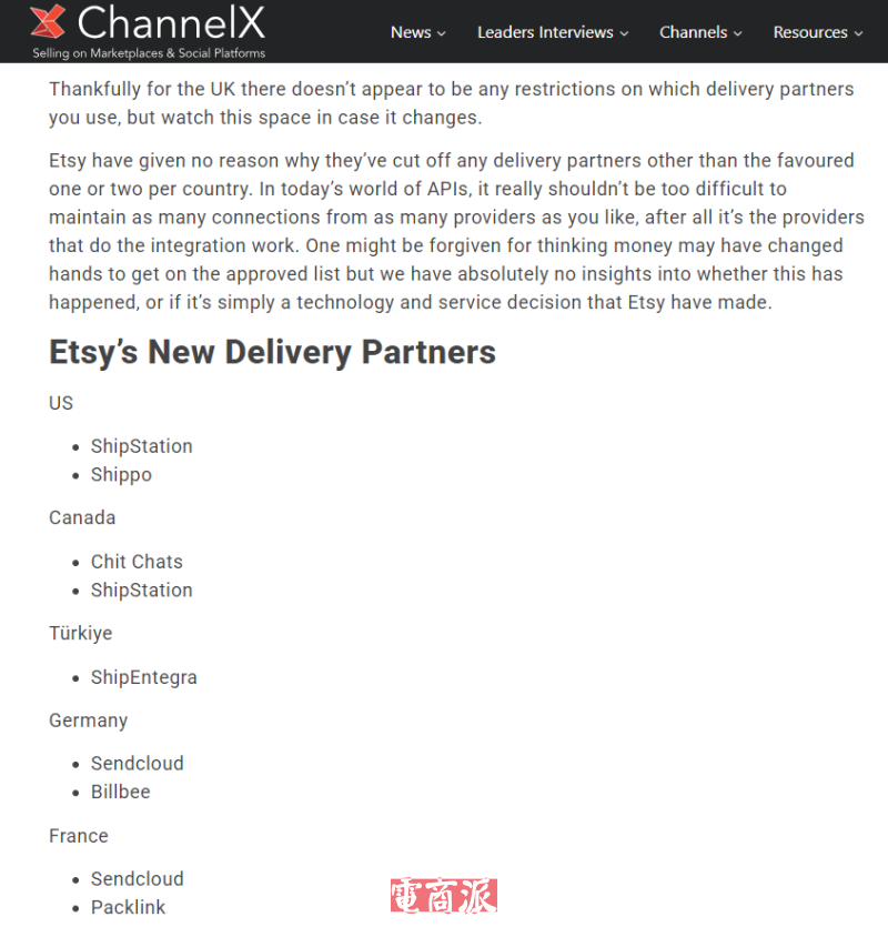 根据Etsy公布的“新配送合作伙伴”名单,不同国家的推荐服务如下。美国:ShipStation、Shippo;加拿大:Chit Chats、ShipStation;土耳其:ShipEntegra;德国:Sendcloud、Billbee;法国:Sendcloud、Packlink。目前,英国卖家尚未受到此政策的影响,可继续自由选择配送服务。但Etsy并未排除未来在英国也实施相似限制的可能性。