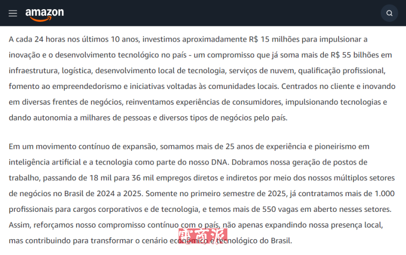 亚马逊过去十年在巴西投资总额超过550亿雷亚尔