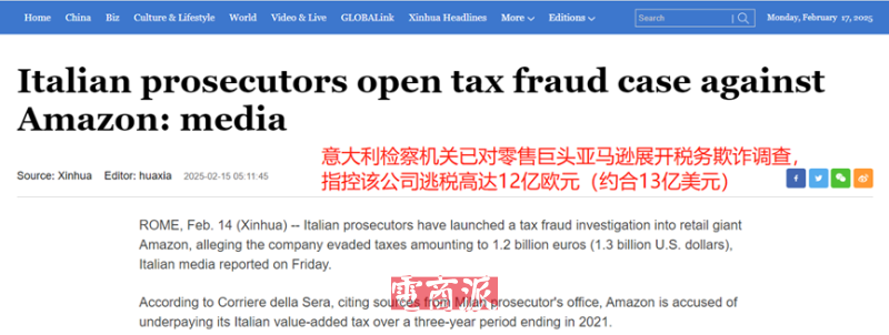 值得一提的是,除了电商卖家以外,各大线上零售平台也是税务监管的重点。不久前,意大利检察机关就对电商零售业巨头亚马逊及其三名高管展开税务欺诈调查。该巨头被指涉嫌在2019-2021年的三年时间内少缴意大利增值税,逃税总额为12亿欧元(约合12.6亿美元)。如果算上罚款和利息,那么亚马逊面临的财务责任的总额可能会高达30亿欧元(约合31.4亿美元)。