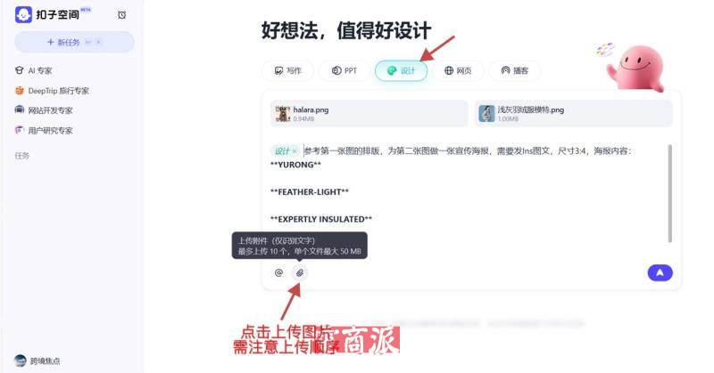 先搜索进入扣子空间官网,选中设计功能,然后把从Ins上保存的海报参考图,以及需要宣传的产品图一起放上去,接着输入一句指令,“参考第一张图的排版,为第二张图做一张宣传海报”。