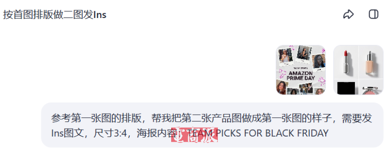 效果还是很不错。原图的风格很像照片墙,中间有醒目的大字提示是亚马逊Prime Day大促。生成的海报很好地还原了这些特征,抠出来的四个美妆产品用了白边修饰,减轻了抠图的孤立感,同时字体模仿也很到位,突出“BLACK FRIDAY”这个核心主题,再用小字补充“TEAM PICKS FOR”(团队严选),彰显产品的独特性。