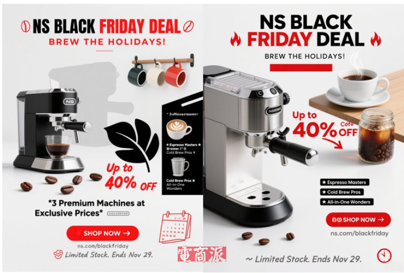 可以看到,生成的海报风格整体是相似的,产品完全由AI生成,还增加了品牌logo,细节拉满;关键信息“Black Friday Deal”“40% OFF”被放在显眼处,加上一些细小的火焰、闹钟等图案做点缀,营造出一种大促临近的紧张氛围感。