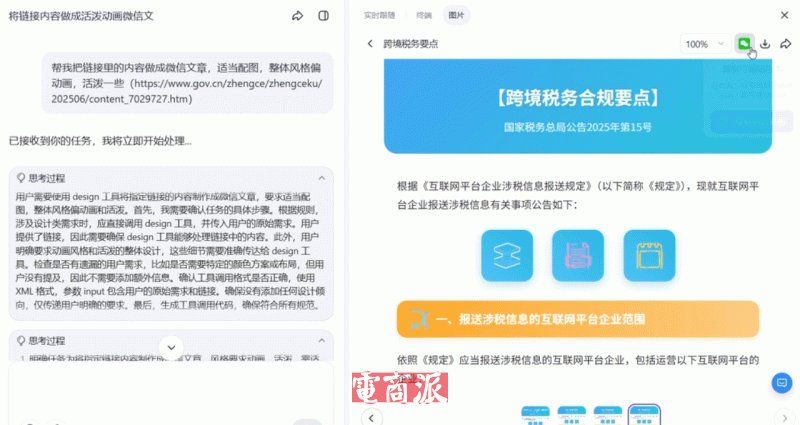接着,再试试生成社媒图文,这个功能可延伸的内容比较多,可以做小红书图文、微信排版文章等。这里就分别做一篇跨境税务新政相关的小红书图文和公众号文章。