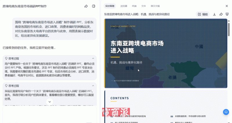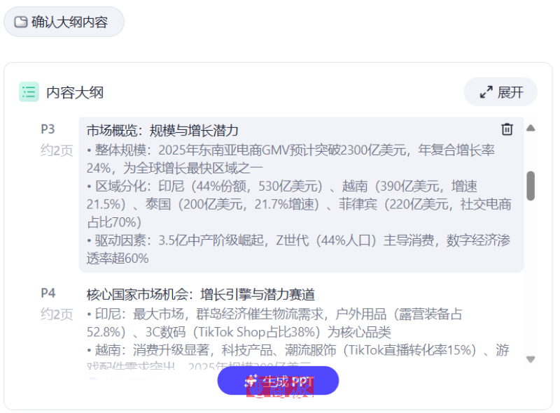 这里就试着做了一份关于跨境电商东南亚市场战略的汇报PPT,没有给具体内容,直接让扣子空间现搜。看一下结果,总共十页的PPT,八个主题,分析了东南亚市场规模、进口政策、消费者网购行为、电商平台竞争格局等,内容完整风格合适,完全可以直接拿去展示。