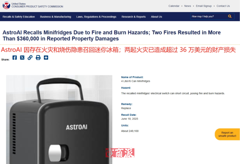 事实上,产品召回的事件并非个例。例如在今年6月,AstroAI的一款迷你冰箱就被通知召回,原因同样是存在电气短路风险可能引发火灾或造成烧伤。截至召回时,收到至少70起有关该冰箱冒烟、燃烧、熔化或起火的报告,造成了巨大的财产损失。