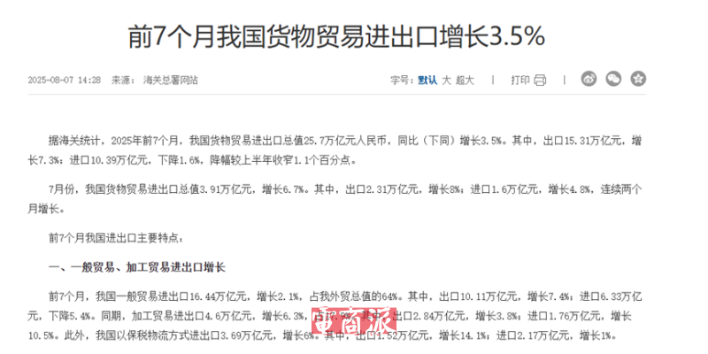 不过,尽管部分传统外贸企业面临困境,但更多企业正抓住机遇实现逆势增长。据海关统计,2025年前7个月,我国货物贸易进出口总值25.7万亿元人民币,同比增长3.5%。其中,出口值达15.31万亿元,同比增长7.3%,仍然保持了向上向好势头。