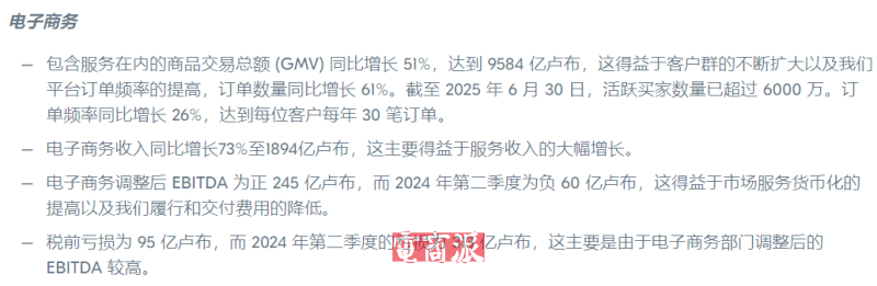 其中,电商部门作为核心业务,贡献了主要的增长动力。该季度电商GMV达到9584亿卢布,同比增长51%;收入达1894亿卢布,同比增长73%;调整后EBITDA为245亿卢布,较去年同期的亏损60亿卢布大幅改善。