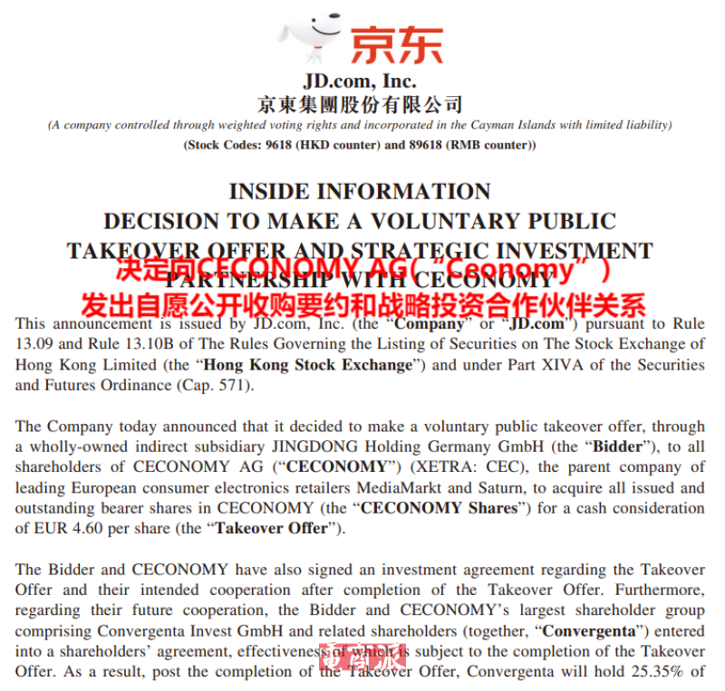 7月,京东正式发出收购邀约,计划以22亿欧元(约合185亿元),收购德国零售巨头Ceconomy。这是中国电商出海欧洲的最大一笔收购项目。Ceconomy则是一家消费电子零售巨头,同时经营着MediaMarkt、Saturn等连锁超市品牌。
