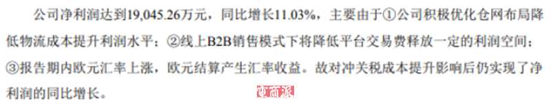 在净利润方面,上半年致欧科技净利润逆势实现双位数增长,这主要得益于三点:一是公司积极优化仓网布局降低物流成本;二是加大对亚马逊VC销售模式的投入,线上B2B销售模式下平台交易成本降低;三是欧元汇率上升,欧元结算产生了汇率收益。