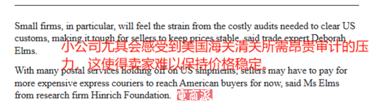 贸易专家Deborah Elms表示,小公司尤其会感受到美国海关清关所需昂贵审计的压力,这使得卖家难以保持价格稳定。纽约女士专营手工女鞋的老板Theobalds坦言,低成本的切入点不复存在,她不知道如何向客户解释商品价格上的变化。