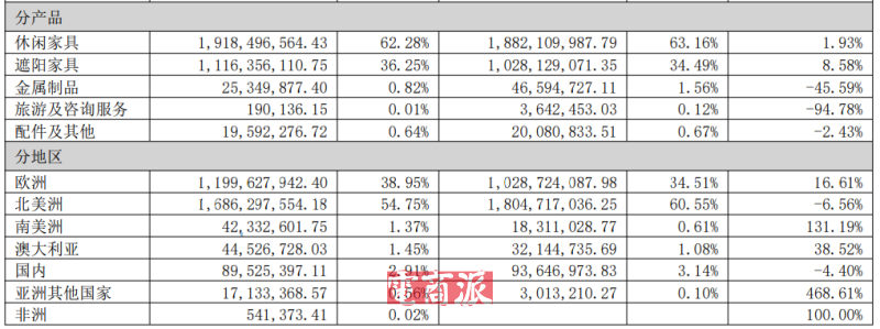 也正因布局早,直到现在,欧洲和北美依然是浙江永强最重要的两员“营收大将”。其中北美地区上半年营收16.86亿元,占比54.75%;欧洲地区营收约12亿元,占比38.95%。两地总计占比超90%。