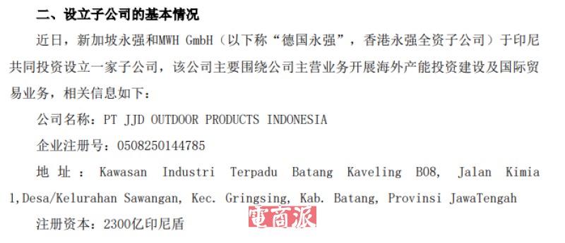 8月,浙江永强通过子公司新加坡永强和德国永强,在印尼成立子公司,注册资本达2300亿印尼盾(约合1亿人民币),主营业务同样是海外产能布局及国际贸易。