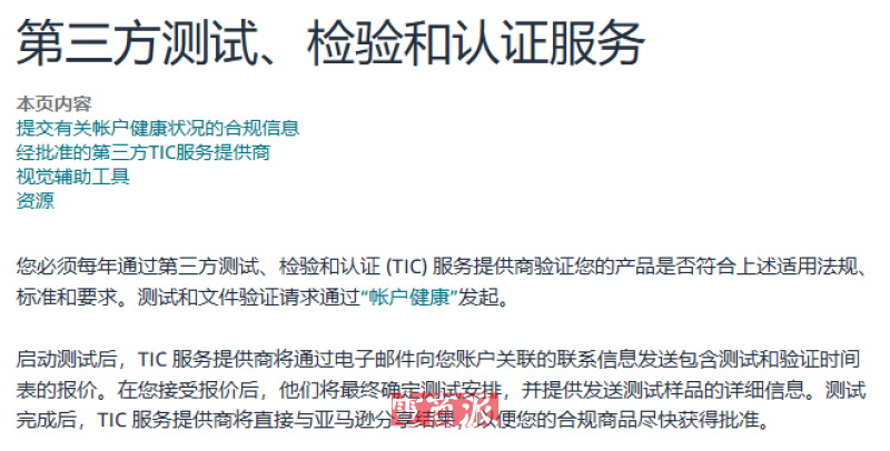 过去这一验证是卖家自己找检测报告、证书上传,平台再人工或系统抽查,但这样的模式有一个很大的问题,就是真假不好分辨,给一些不法卖家制造了钻空子的机会。而在今年9月之后,卖家必须找亚马逊指定的TIC实验室,结果由实验室直接对接平台系统,流程更加透明。