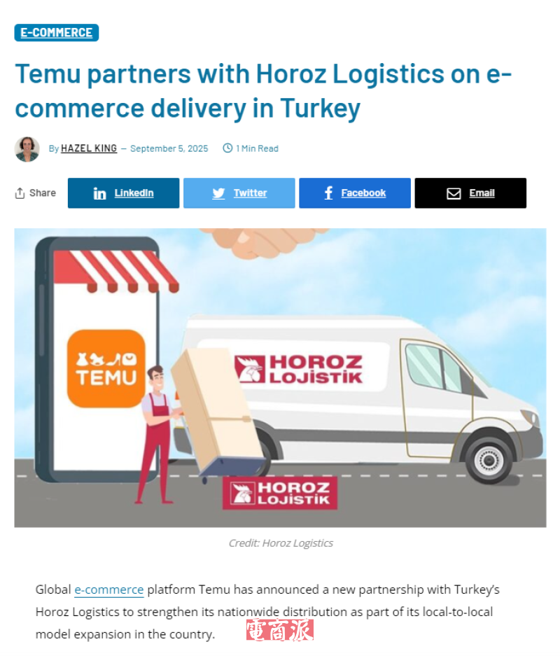9月6日消息,土耳其本土物流公司Horoz Lojistik表示,已与TEMU达成协议,将为TEMU在土耳其本土市场的电商业务提供配送服务。Horoz方面称,此次战略合作旨在为TEMU平台上销量大的商品或重量超过30公斤的商品,提供土耳其境内快速且安全的配送服务。双方还期望通过此次合作,在电商物流领域产生协同效应。