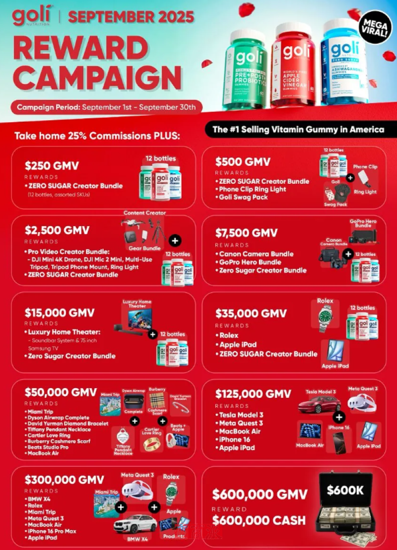 举例来说,今年9月,美国保健品类目顶流品牌goli将为合作的TK达人提供25%的销售佣金,在此基础上,每达到一个GMV级别,再送豪礼或者是现金,包括30万美金GMV送宝马X4,60万美金GMV直接奖60万美金现金,100万美金GMV豪奖100万美金现金等,可以说是相当大的诱惑。