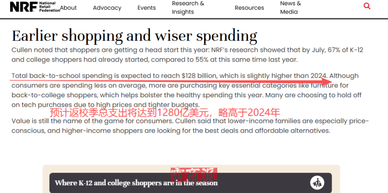 今年返校季,早在7月就有近七成的K-12和大学购物者开始购物,并且NRF也预测道,尽管消费者平均支出有所减少,但更多人购买了返校季家具等关键必需品,今年返校季总支出将达到1280亿美元,略高于2024年。