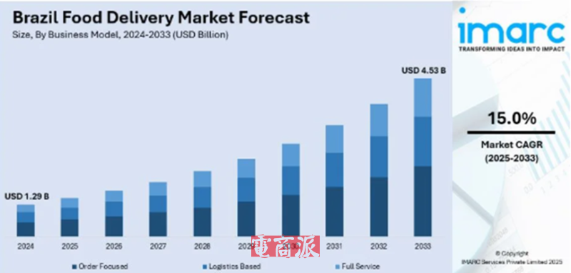 IMARC集团的数据显示,随着城市化进程加快以及互联网普及率持续提升,巴西食品配送市场也在持续扩大,2024年,巴西外卖市场规模已经达到12.9亿美元,预计到2033年,这一数值将进一步扩大至45.3亿美元,复合年增长率为15.0%。