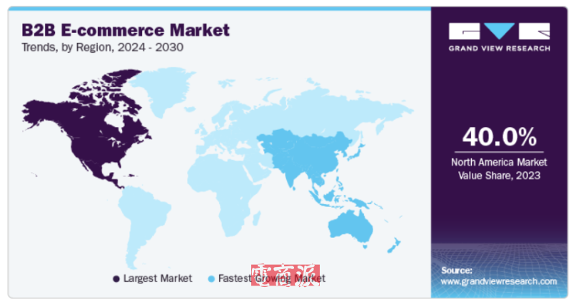 市场研究机构Grand View Research的报告指出,2024年至2030年,预计全球B2B电商市场规模将以18.2%的复合年增长率快速扩张,到2030年,整个市场规模有望达到57.58万亿美元。这其中,北美市场占据重要份额,目前占比约为40%。