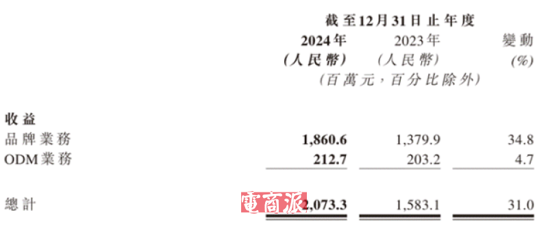 据卡罗特财报,2024年卡罗特营收达20.73亿元,同比增长31%。其中,品牌业务既是营收“大梁”,也贡献了最大增量,营收18.61亿元,同比大涨34.8%;其次是ODM业务,营收2.13亿元,同比增长4.7%。