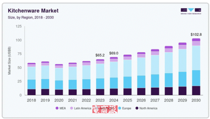 市场研究机构Grand View Research.的报告显示,2024年-2030年间,预计全球厨具市场规模将以6.9%的复合年增长率持续扩张,到2030年时达到1027.8亿美元。这其中,亚太、欧洲、北美是份额占比最大的三个市场。