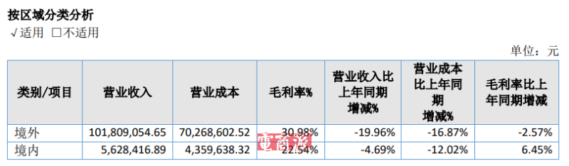 而致使尚洋科技业绩下滑的一个重要原因是其占比高企的出口业务。财报显示,今年上半年尚洋科技境外营业收入1.02亿元,同比下滑19.96%,占公司营收总额近95%。在当下急剧变化的跨境贸易环境,这样的高出口占比,极有可能直接影响尚洋科技的经营状况。